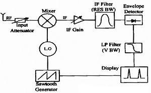 頻譜分析儀從頻譜測(cè)試的實(shí)現(xiàn)技術(shù)上可分為兩類(lèi):使用傅里葉變換(FFT)技術(shù)的數(shù)字頻譜分析儀和使用模擬濾波器的模擬頻譜分析儀(包括并行濾波器頻譜儀和掃頻式頻譜儀)。數(shù)字頻譜分析儀使用數(shù)值計(jì)算的方法處理一定時(shí)間周期的信號(hào),可提供頻率、幅度和相位信息,對(duì)周期信號(hào)和非周期信號(hào)均能分析。特點(diǎn)是速度快,精度高,適合分析窄帶信號(hào)。模擬頻譜分析儀的掃頻式頻譜分析儀是目前最常見(jiàn)的類(lèi)型,在掃頻頻譜分析中普遍采用超外差式方式。掃頻式頻譜分析儀可分析穩(wěn)定和周期變化信號(hào),提供信號(hào)幅度和頻率信息,適合寬頻帶寬的快速掃描試驗(yàn)。Agilent的ESA系列經(jīng)濟(jì)型頻譜分析儀和HP8563等都屬于掃頻頻譜分析儀,其簡(jiǎn)化原理框圖見(jiàn)圖1,掃頻頻譜儀實(shí)際上是多級(jí)混頻結(jié)構(gòu)。這種分析方法最核心的部分是它的混頻器和中頻濾波器。混頻器將被測(cè)信號(hào)下變至中頻,然后在中頻上進(jìn)行處理,得到幅度。本地振蕩器采用掃頻振蕩器,它的輸出信號(hào)與被測(cè)信號(hào)中的各個(gè)頻率分量在混頻器內(nèi)依次進(jìn)行差頻變換,所產(chǎn)生的中頻信號(hào)通過(guò)中頻窄帶濾波器后再經(jīng)放大和檢波,加到視頻放大器作示波管的垂直偏轉(zhuǎn)信號(hào),使屏幕上的垂直顯示正比于各頻率分量的幅值。本地振蕩器的掃頻由鋸齒波掃描發(fā)生器所產(chǎn)生的鋸齒電壓控制,鋸齒波電壓同時(shí)還用作示波管的水平掃描,從而使屏幕上的水平顯示正比于頻率。