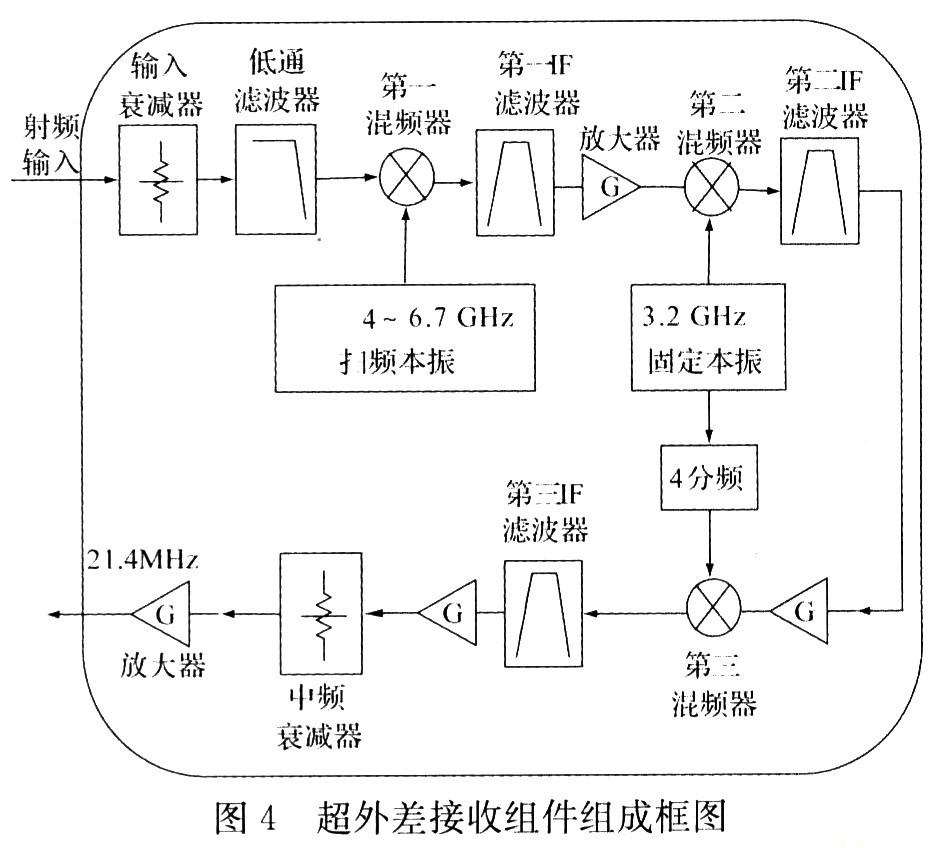 組件采用三級混頻方式實現,第一中頻4 021.4 MHz,第二中頻821.4 MHz,第三中頻21.4MHz,這樣選擇的目的是第三混頻需要的800 MHz本振可以由第二混頻需要的3.2 GHz本振4分頻產生,從而減少了本振數量,降低了體積。