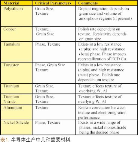 表1總結出半導體生產中可以通過X射線衍射量測的多晶材料。幾種有代表性的應用技術在下面詳細列出。