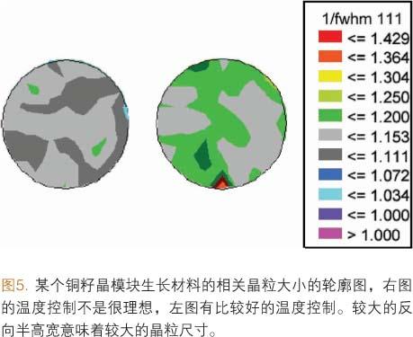 這里舉一個問題診斷的例子,它是因為不良的溫度控制導致某銅籽晶模塊生長的材料晶粒尺寸產生偏移。通過對該模塊生長的銅作日常的平板電阻和膜厚監測,并沒有發現任何異常,但線上的XRD系統顯示相關的晶粒尺寸有偏移(反向半高寬FWHM)。圖5說明了某個銅籽晶模塊生長材料的相關晶粒大小的輪廓圖,右圖的溫度控制不是很理想,左圖有比較好的溫度控制。較大的反向半高寬意味著較大的晶粒尺寸。