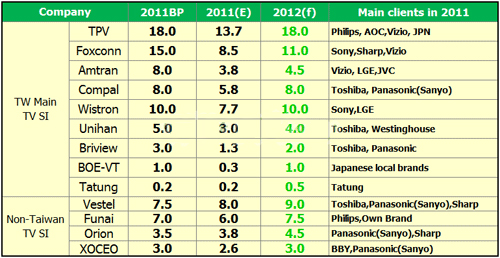 受到品牌需求減少影響,加上部分品牌增加自制比率,臺灣代工廠第三季呈現(xiàn)5.2%之衰退,但經(jīng)過庫存去化及品牌預(yù)拉升年底銷售業(yè)績影響,預(yù)估第四季將有6-9%之成長力道。但整年度看來,TPV(冠捷)還是坐穩(wěn)第一名,明年如能順利掌控PHILIPS品牌,2012年度計(jì)劃有可能朝20百萬臺邁進(jìn);鴻海(Foxconn)和緯創(chuàng)(Wistron)則受到Sony大幅調(diào)降電視需求影響,今年目標(biāo)恐難以達(dá)成,明年成長力道也將受到限制;仁寶(Compal)、永碩(Unihan)、景智(Briview)主要客戶群皆以日本品牌Toshiba(主要為歐日訂單)為主,日震和歐洲經(jīng)濟(jì)困頓,也大大影響其年度績效;瑞軒(Amtran)則受到Vizio波及,整體代工量也未能達(dá)標(biāo)。盡管臺灣電視代工廠有Philips、Sony、Toshiba及Vizio等國際品牌及自有品牌的加持,但還是逃不過大環(huán)境不佳的沖擊。