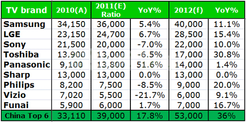 而今年Sharp以日本市場為主軸;Toshiba以日、歐為主要銷售地區(qū),年成長表現(xiàn)衰退;Sony銷售地區(qū)橫跨歐、美、日,除了區(qū)域性需求不振,加上其組織策略反映較緩慢,不僅財(cái)報(bào)未見起色,年度液晶電視出貨目標(biāo)更呈現(xiàn)7%之衰退,下修至20百萬臺;Panasonic因購買Sanyo品牌,看似整體市占率提升,但內(nèi)部獲利壓力頗大,除打算出售位于日本茂原的六代廠,亦將減少8.5代廠的產(chǎn)能,后續(xù)仍須觀察;Philips以歐洲為主要市場,難幸免于歐債風(fēng)暴沖擊;Vizio面臨與LGD之合作關(guān)系生變,加上北美市場不景氣,年度銷售量下滑幅度甚鉅;反觀大陸品牌挾帶雄厚資源,年度銷售量成長依舊維持在17~18%左右,市占率更達(dá)19~20%,2012更預(yù)估有3成之成長力道。