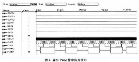 該系統(tǒng)軟件設計是根據(jù)系統(tǒng)功能要求而設計的,基于EPM7128的軟件程序設計分為:輸出脈沖占空比調(diào)節(jié)、頻率調(diào)節(jié)、軟啟動時間調(diào)節(jié)和過壓過流報警。開發(fā)系統(tǒng)使用VHDL語言進行模塊化編程,這樣可以提高程序的移植性,縮短開發(fā)周期,降低開發(fā)成本。而且易于維護系統(tǒng)軟件,提高可靠性。圖4是輸出的兩路PWM脈沖仿真波形,其中GCLK是一個基準時鐘源,CLKl和CLK2分別是經(jīng)VCO轉(zhuǎn)換的頻率調(diào)節(jié)和占空比調(diào)節(jié)信號,SET和SOFT分別是2個外接的4位占空比調(diào)節(jié)和軟啟動調(diào)節(jié)撥段開關(guān)。