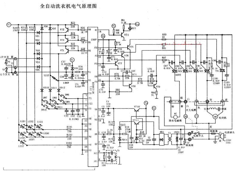 晶體管T11、T10和穩(wěn)壓管DW組成欠壓保護電路。當(dāng)電源電壓不足,T11的基極電壓小于3.9V時,T11截止,T10也截止。Z86C09的P3.1端沒有電壓,常為低電平。T12截止,造成T5~T9的發(fā)射極均懸空,因此T5~T9截止,不受Z86C09控制。這時,雖然Z86C09能夠正常工作,但外圍控制元件全部關(guān)斷,洗衣機不工作。單片機的P3.1端輸入判別欠壓保護電路工作狀態(tài)的信號,只有當(dāng)電壓正常后,單片機才開始執(zhí)行洗衣程序。