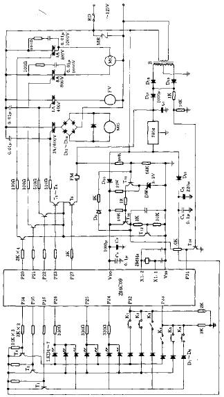 全自動洗衣機由洗衣系統(tǒng)和控制電路組成。其控制電路分為機械和電腦型,電腦型控制電路是以單片機作為控制電路的核心。圖1給出單片機Z86C09組成的全自動洗衣機的控制電路。