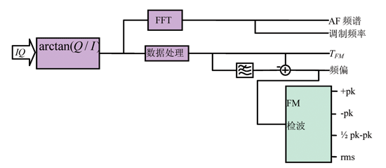 對(duì)此數(shù)組進(jìn)行窄帶低通濾波,獲得載波幅度數(shù)組Vc ,計(jì)算AM-DC與Vc的差分?jǐn)?shù)組,它與Vc的比值A(chǔ)Mdeep 數(shù)組表述調(diào)制深度,對(duì)其進(jìn)行檢波:正峰值 (+pk):數(shù)組中的最大值;負(fù)峰值 (+pk):數(shù)組中的最小值;峰-峰值/2 (1/2pk-pk):數(shù)組中的最大值與最小值差值的一半;均方根值 (rms):數(shù)組中數(shù)值的均方根值。
