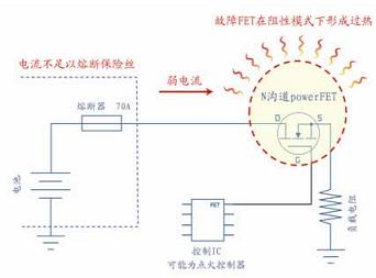 圖1 說明了一個出現故障的powerFET可能并不會產生一個完全硬短路的過流情況,而是產生阻性短路,因此通過I2R發熱造成不安全的溫度。在這種情況下,所形成的電流可能并沒有高到使一個標準保險絲熔斷并阻止印制電路板上的熱失控。