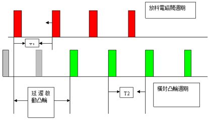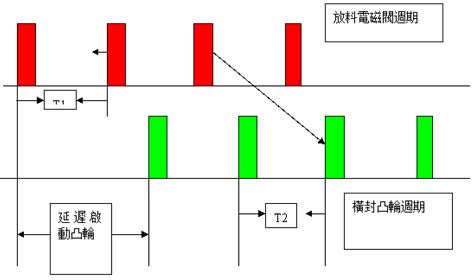 在打開第一個電磁閥間隔1s后打開第二個電磁閥。如此則在落料桶內同時有兩包料,必須保證在后續的熱封電子凸輪運行周期此完全吻合才能確保無誤,如圖5所示。