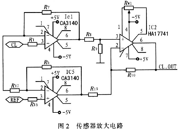 如圖2所示,采用3個運算放大器組成的測量放大電路,前段有2個高輸入阻抗的CA3140構成差動輸入。后端的HAl7741實際上是一差動跟隨器,其增益近似為1。為了保證放大器的精度,負反饋電阻選擇高精度低溫漂的精密電阻,且電路閉環增益不太大。同時為防止電路板表面的漏電流,對電路板進行了局部鏤空。為了能在野外惡劣環境下工作,對電路板還進行了防潮處理和電子屏蔽。