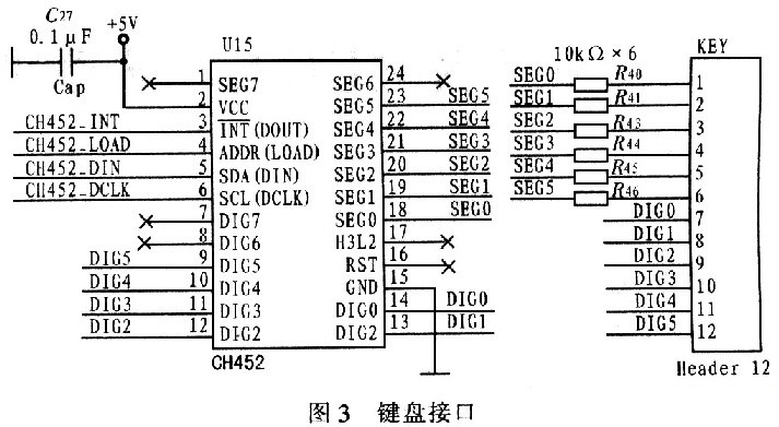 為便于用戶使用,該系統共36個按鍵,其中有26個英文字母按鍵、4個快速功能按鍵、4個方向按鍵以及確定和取消按鍵,這些按鍵制作成6x6的薄膜開關按鍵。所有按鍵均有CH452器件控制,這樣可降低主處理器的工作負擔,大大簡化了軟件編寫程序。CH452內置64鍵鍵盤控制器,基于8x8矩陣鍵盤掃描;內置按鍵狀態輸入的下拉電阻;內置去抖動電路;鍵盤中斷,可以選擇低電平有效輸出或者低電平脈沖輸出;提供按鍵釋放標志位,可供查詢按鍵按下與釋放;支持按鍵喚醒,處于低功耗節電狀態中的CH452可以被部分按鍵喚醒。