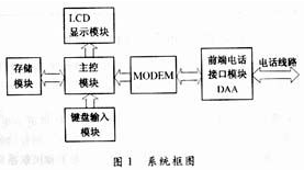 系統框圖見圖1。該系統的核心是主控模塊,主要由微處理器構成,控制整個系統軟硬件的運行。一方面處理各部分外圍電路的控制信息,另一方面完成接收和需要發送的信息的智能化處理,其功能具備可擴展性,為以后功能進一步加強保留軟件接口;存儲模塊包括外部RAM、EPROM存儲器和相應的掉電保護電路,用于存放系統運行中需要處理、交換的數據,同時還用于存儲接收到的或需要發送的數據信息;EPROM主要用于存放系統軟件及存放漢字字庫;鍵盤輸入模塊用于接收來自用戶的輸入數據,包括控制信息和數據信息,它是用戶對該系統的輸入接口;LCD模塊由LCD顯示器及相關控制電路組成,可以顯示中文、英文、數字和各類字符,它是該系統對用戶的輸出接口。MODEM模塊由一片嵌入式MODEM芯片及相關外圍電路組成。一方面用于調制由主控模塊送來的數據,將數字信息轉化為模擬信號,送入前端電話接口模塊DAA電路;另一方面將DAA電路接收的模擬信號轉化為數字信號,并交給主控模塊進一步處理。它是所有信息的進出口,起著至關重要的作用。