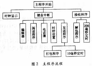 電話終端的核心是MCS-89C52微處理器。通常情況下,微處理器工作在低功耗方式,當有鍵按下時,退出低功耗模式,進入主菜單。在主菜單中,用戶可以選擇操作。為減少冗余代碼,軟件采用匯編語言編寫,字庫固化在外部擴展的EPROM中,內部EPROM存放程序。圖2為主程序流程。
