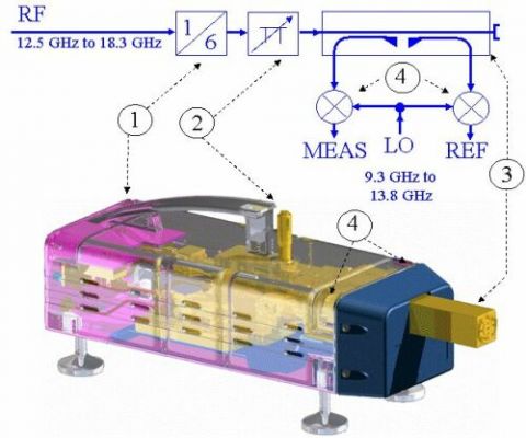 圖1顯示了R&S ZVA-Z110內部的CAD結構圖和原理框圖該變頻模塊包含用作隔離參考和測量信號的通道源倍頻器、可調節波導衰減器、定向耦合器這些參考和測量通道通過諧波混頻器進行下變頻