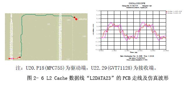 因為板上這兩個總線的負載最多為2個負載,且這幾個芯片之間的距離很近,相關的PCB走線很短,所以信號時序關系一般能夠滿足要求(盡管其工作頻率很高)。下面給出L2Cache總線上典型時鐘線、地址線以及數據線的PCB走線圖以及在HyperLynx仿真軟件的BoardSim工具下的仿真波形。MPC755、MPC107、PowerSpan和GVT71128芯片的IBIS模型均來自于芯片廠商(Motorola、TUNDRA和GALVENTECH)。