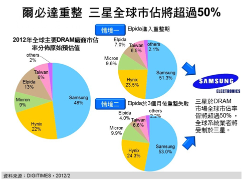 DIGITIMES Research分析師柴煥欣分析,受DRAM價格自2011年第1季持續性下滑影響,加上日圓匯率亦持續升值加重成本負擔,全球第3大DRAM供貨商爾必達(Elpida)在歷經連續5季虧損后,終于無法支撐,于2012年2月27日無預警申請破產保護,并將進行重整。
