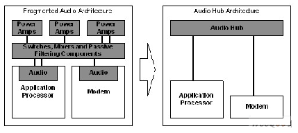 近年來發展起來的音頻中心(Hub)解決方案,通過將所有所需的音頻功能集整合到一個單芯片上,能夠方便地將高性能應用處理器和更具成本效益的調制解調器的系統集成在一起。該解決方案消除了系統中的重復,將元器件的相互依賴降到了最小程度,并為未來產品的研發提供了一個穩定的平臺。