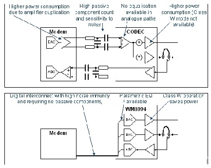 圖1:WM8994采用以應用為中心的調制解調器架構?! ?/p>