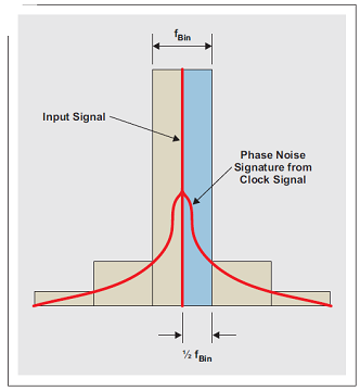 在采樣過程中,輸入信號與采樣時鐘信號混頻在一起,包括其相位噪聲。當進行輸入信號 FFT 分析時,主 FFT 容器 (bin) 集中于輸入信號。采樣信號周圍的相位噪聲(來自時鐘或輸入信號)決定了鄰近主容器的一些容器的振幅,如圖 7 所示。因此,小于 1/2 容器尺寸的偏頻的所有相位噪聲都集中于輸入信號容器中,且未增加噪聲。因此,相位噪聲整合帶寬下限應設(shè)定為 1/2 FFT 容器尺寸。 FFT 容器尺寸計算方法如下: