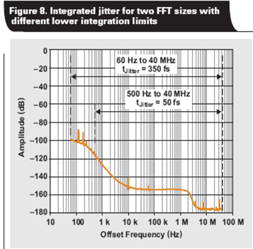 要確定正確的限制,您必須記住采樣過程中非常重要的事情是:來自其他尼奎斯特區(qū)域的時鐘信號偽帶內(nèi)噪聲和雜散,正如其出現(xiàn)在輸入信號時表現(xiàn)的那樣。因此,如果時鐘輸入的相位噪聲不受頻帶限制,同時沒有高頻規(guī)律性衰減,則整合上限由變壓器(如果使用的話)帶寬和 ADC 自身的時鐘輸入設(shè)定。一些情況下,時鐘輸入帶寬可以非常大;例如,ADS54RF63 具有 ~2 GHz 的時鐘輸入帶寬,旨在允許高時鐘轉(zhuǎn)換速率的高階諧波。