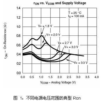 低導通電阻往往是模擬開關在音頻切換時的主要選擇因素。值得注意的是,導通電阻是針對具體的VCC、VIN(電壓輸入)及給定負載電流而指定的。在晶體管級,RON為器件長度(L)、器件寬度(W)、電子與空穴遷移率、氧化層電容、門限電壓及信號電壓的函數(shù)。