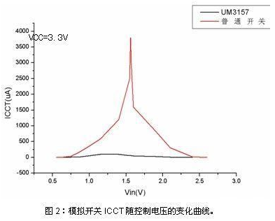 圖2中可以看出采用該改善技術的英聯(lián)UM3157模擬開關產品與普通同系列模擬開關產品在ICCT上的顯著區(qū)別。