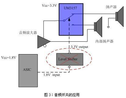 此外,英聯(lián)的低ICCT系列模擬開關具有更低的VIH電平值,可以使用較低的控制電平實現(xiàn)開關的高電平切換控制。產品的這種特性大大減少了系統(tǒng)工程師設計電路的復雜性,特別是在供電電源和控制信號電平不匹配的便攜產品應用中可以免除使用電平轉換模塊,從而有效降低了成本。以模擬開關用來切換音頻信號為例,如圖3所示,可以使用ASIC傳輸過來的1.8V電壓直接來控制UM3157的控制管腳,而不必采用電平轉移器也能在實現(xiàn)開關切換的同時達到很小的漏電流。此外,由于低ICCT模擬開關不消耗很多功耗(大約1uA),且開關的導通電阻隨工作電壓的增加而降低,設計人員可以使用較高的供電電壓來達到更低的導通電阻。對于典型的音頻開關或USB應用,低的導通電阻是非常重要的。