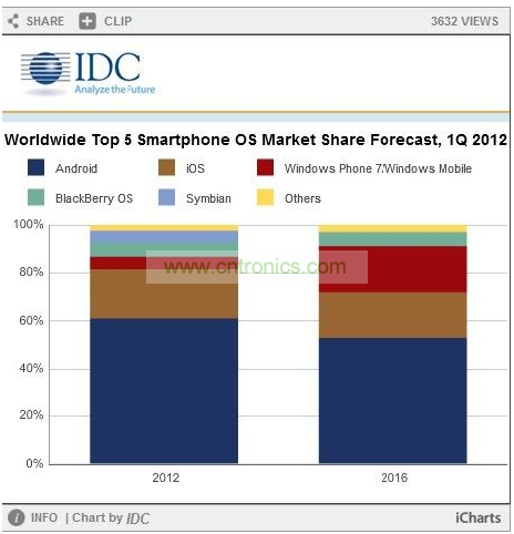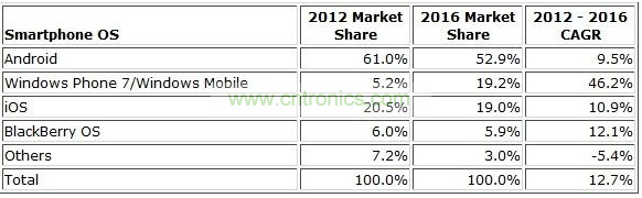 下表反映了IDC對(duì)2012年和2016年全球智能手機(jī)操作系統(tǒng)所占市場(chǎng)份額以及2012到2016年之間復(fù)合年增長(zhǎng)率的預(yù)期: