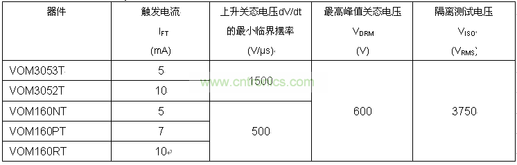VOM3052T和VOM3053T具有高達1500V/μs的靜態(tài)dV/dt,尤其適用于噪聲環(huán)境。在這些地方,即使在輸入端沒有任何觸發(fā)信號,由于在輸出負載上存在高擺率瞬態(tài),較低的dV/dt可能引起晶閘管觸發(fā)。