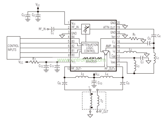 Maxim的MAX2055、MAX2027可用作MAX12559的緩沖放大器,MAX2055是一個(gè)帶寬在30~300MHz的數(shù)控可變?cè)鲆娣糯笃?圖2)。