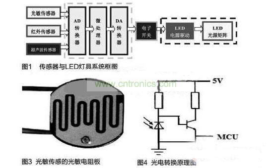 傳感器作為信號采集和機電轉換的器件,其機電技術已相當成熟,近幾年MEMS(微機電系統)技術興起又將傳感器技術向小型化、智能化、多功能化、低成本化大踏步邁進。光敏傳感器、紅外傳感器等各種類型的傳感器都可與LED照明燈具組成一個智能控制系統,傳感器將采集來的各種物理量信號轉換成電信號,可以經由集成電路化的AD(模數)轉換器 、MCU(微控制器)、DA(數模)轉換器對所采集的信號進行智能化處理,從而控制LED照明燈具開啟和關閉。人類可以籍此在MCU上設定各種控制要求,控制LED燈的開關時間、亮度、顯色、多彩變幻,從而達到省電節能的目標。傳感器與LED燈具組成的系統框圖如圖1所示。目前的集成電路制造技術已經可以將AD、DA、MCU集成在一個5mm×5mm或更小的封裝內,安裝在燈具內既不占面積而且十分方便。