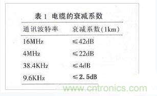 導(dǎo)線的電阻對信號的影響很小,可以忽略不計(jì)。電纜的分布電容C主要是由雙絞線的兩條平行導(dǎo)線產(chǎn)生。信號的損失主要是由于電纜的分布電容和分布電感組成的LC低通濾波器。通訊波特率越高,信號衰減也會越大。常規(guī)電纜的衰減系數(shù)見表1。