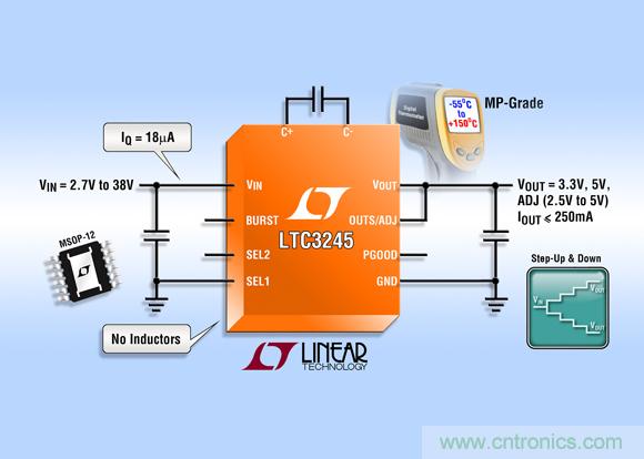 凌力爾特推出通用型 250mA 高電壓降壓-升壓型充電泵 LTC3245 的新型高可靠性 MP 級、較寬溫度范圍版本。MP 等級器件具有 -55°C 至 +150°C 的工作結溫范圍。LTC3245 采用開關電容器分數轉換,以在 2.7V 至 38V 的寬輸入電壓范圍內保持調節作用,并產生一個 3.3V、5V 或可調 (2.5V 至 5V) 的穩壓輸出。內部電路自動地選擇 2:1、1:1 或 1:2 的轉換率,以在輸入電壓和負載條件變化時優化效率。低工作電流 (無負載時為 18μA,停機時為 4μA) 和很少的外部器件數目 (3 個小型陶瓷電容器,無電感器) 使 LTC3245 非常適用于低功率和空間受限的汽車應用 (例如 ECU / CAN 收發器電源)、工業內務處理電源、以及高效的低功耗 12V 至 5V 轉換。