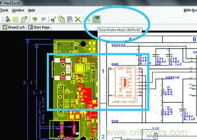6.0版本中的交叉探測(cè)(X-probe)功能能夠在軟件內(nèi)實(shí)現(xiàn)原理圖與PCB設(shè)計(jì)視圖之間的即時(shí)引用,從而進(jìn)一步加快設(shè)計(jì)過(guò)程。通常情況下在PCB視圖中元件的識(shí)別是比較直觀、容易的,但在原理圖中找到該元件的對(duì)應(yīng)符號(hào)卻不那么容易,除非用戶(hù)對(duì)整個(gè)系統(tǒng)都了如指掌。通過(guò)交叉探測(cè)功能,用戶(hù)只需在任一視圖中點(diǎn)擊某個(gè)元件,即可迅速跳轉(zhuǎn)到對(duì)應(yīng)視圖中的同一元件。該功能可從PCB視圖跳轉(zhuǎn)到原理圖,反之亦然。