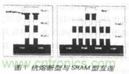 Actel 公司的抗熔斷型FPGA是用先進的CMOS工藝制作的,內部采用專利的金屬-金屬抗熔斷元件。抗熔斷互連就象純金屬互連一樣,而與用晶體管開關的SRAM 互連截然不同。抗熔斷結構消除了CRAM互連開關中圖騰柱結構的功耗,并且縮小了器件的尺寸,使全部連線資源都位于硅片的頂部。這種結構可以更形象地用掩 埋在金屬層上的“模塊海洋”來描述,極大地減少了芯片的尺寸以及開關的電阻與電容,從而降低了功耗(圖1)。
