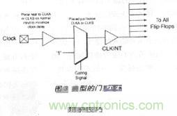 這 是最廣泛使用的方法,即在器件末使用時截斷時鐘來降低功耗。然而正確地截斷時鐘十分重要。門控信號與門控邏輯應正確地設計,以消除時鐘線上的任何毛刺。再 者,門控邏輯會增加時鐘的延時,影響建立時間與保持時間。由于抗熔斷是一種極快速的技術,引入的延時很小且容易控制。在使用時鐘門控時,用戶應仔細地安置 門控邏輯,將時鐘網絡的延時降低到最小限度。典型的門控邏輯如圖3所示。