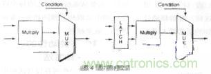 這 是一種在塊輸出不用時防止輸入信號使塊開關工作的技巧。例如考慮一個乘法器,它的輸出僅在某些特定條件下才使用。在此場合可增添一個鎖存器,這樣每當輸出 不用時,乘法器的輸入將阻止不必要的開關動作帶入乘法器(圖4)。一個鎖存器只需一個組合單元,并不占用過多芯片面積。
