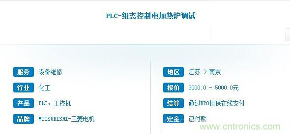該項目由電加熱爐設(shè)備制造商發(fā)起,為該企業(yè)某型號的電加熱爐提供電氣控制開發(fā),具體由PLC作為控制主體,結(jié)合工藝需求完成編程和組態(tài)設(shè)計,后期完成儀表接線和調(diào)試工作,工作周期30天。該活兒經(jīng)過3天發(fā)布后,接到17名工程師的投標(biāo)方案,最終由周邊某市的一名gongkongBPO工程師承接完成。