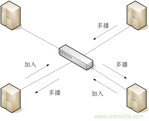 當一臺裝置想加入某個多播組時,首先發出GMRP加入報文,交換機將接到的GMRP加入報文的端口加入該多播組,并在VLAN中廣播該GMRP加入報文,VLAN中的多播源就知道了多播成員的存在。當組播源向組播組發送組播報文時,交換機只把該報文從先前加入到該組播組的端口轉發出去,從而實現VLAN內的二次組播。如圖 1-2所示。