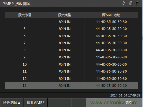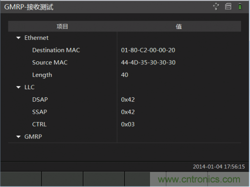 接收測試頁面用于接收來自其他設備發送的GMRP報文。界面枚舉出報文類型,以及組播地址。并且對報文內容也可以做到解析。如圖 1-4所示: