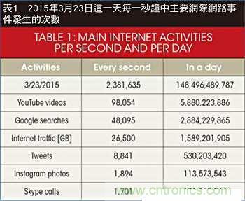 網際網路實現了廣泛的資料通訊服務,如電子郵件、視訊下載、Google搜索、推特(Twitter)消息發送、Skype電話等等。表1列出了每天和每一秒鐘的主要網際網路活動數量。