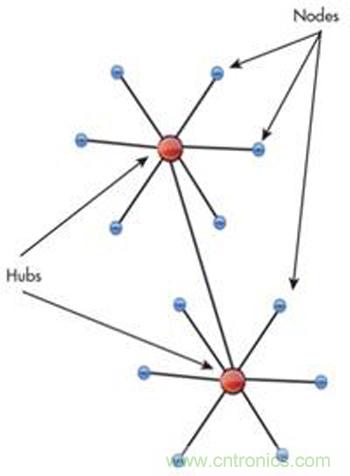 在網路術語中,所有連接到網路的設備都被分類為網路節點。在最基本的網路結構中,各節點通過集線器連接在一起。即多埠設備將任何到達的資訊包復制到與之連接的所有其他埠(節點)(圖1)。