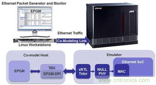 將這種設置與采用虛擬方法的設置進行比較,如明導國際(Mentor Graphics)的虛擬乙太網設備(VirtuaLAB)。在此場景中,裝有Linux環境的工作站連接硬體加速器,在工作站上用軟體對乙太網測試儀實現一樣的行為模式。基于成熟的實現智慧財產權(IP),模型準確再現了實際的物理測試儀。