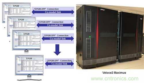VirtuaLAB可為每個工作站提供32GMII、XGMII、XLGMII/CGMII和CXGMII埠。多個工作站的多個VirtuaLAB應用可以結合在一起,即實現多個傳輸通道,可支援多埠數所需配置。采用高速鏈路(HSL)卡將各個工作站的協同模型(Co-model)連接到模擬器中。緊密集成的傳輸機制已準備就緒,設計時鐘性能已調節至最佳化,并且它對測試平臺來說是透明的。由于采用并行運行時和調試架構,資料流(Data-plane)硬體模擬流量會隨埠數呈線性增長。圖4為多個協同模型拓撲的架構圖。