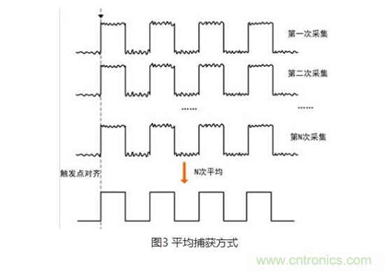 第三個就是平均捕獲模式了,這個名字也非常容易理解,就是采集N屏信號,將它們在觸發位置對其,然后做平均運算。