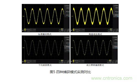 在了解完四種捕獲模式的工作原理之后,我們來做一個對比,在輸入一個相同的信號時,標準捕獲模式下可以觀察到信號中存在噪聲,峰值捕獲模式下信號的噪聲較為明顯,而在平均捕獲模式及高分辨率捕獲模式下,幾乎沒有看到隨機噪聲。