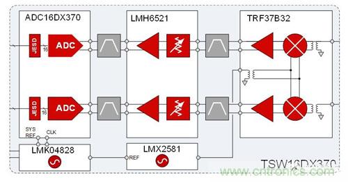 TI設計的700-2700MHz雙通道接收機和16位ADC及100MHz IF帶寬參考設計(TIDA-00360),展示了TSW16DX370評價模塊(EVM),該模塊是適用于有源天線陣系統的超外差接收機。圖2顯示了框圖。該參考設計使用TRF37B32雙混合器將輸入RF信號轉換為中頻(IF)。該混合器具有優異的增益、噪聲系數和輸入線性性能,可用于任何高端通信系統。TRF37B32的功率耗散水平在同類設備中最低。這在必須使用幾十個到幾百個接收機的系統中非常重要。