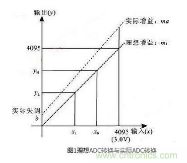常用的A/D轉換器主要存在:失調誤差、增益誤差和線性誤差。這里主要討論失調誤差和增益誤差。理想情況下,ADC模塊轉換方程為y=x×mi,式中x=輸入計數值 =輸入電壓×4095/3;y=輸出計數值。在實際中,A/D轉換模塊的各種誤差是不可避免的,這里定義具有增益誤差和失調誤差的ADC模塊的轉換方程為y=x×ma±b,式中ma為實際增益,b為失調誤差。通過對F2812的ADC信號采集進行多次測量后,發現ADC增益誤差一般在5%以內,即0.95。
