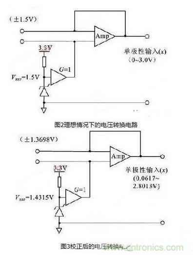 在實際應用中,所采集的信號經常為雙極型信號,因此信號在送至ADC之前需要添加轉換電路,將雙極型信號轉化為單極型信號。典型的轉換電路如圖2所示。對于ADC模塊,考慮到增益誤差和失調誤差對輸入范圍的影響,轉換電路需要調整為如圖3所示的電路。在圖3中,輸入增益誤差的參考范圍已經改變。