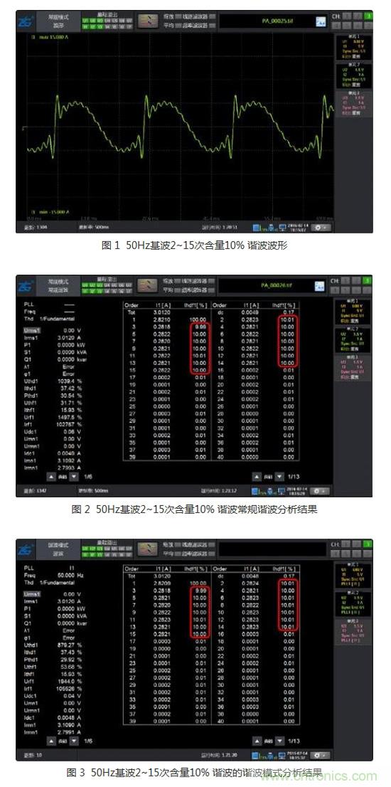 信號二:基波頻率50Hz,含2~15的奇次諧波,各次含量同樣均為10%