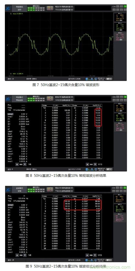 如圖 7所示只包含50Hz基波的2~15次的偶次諧波的波形,受偶次諧波的影響,每個基波周期多了兩次過零,而且頻率與基波相近,PLL的濾波器亦無法濾除該諧波,因此PLL結果錯誤,導致諧波分析結果也完全錯誤,此時的常規諧波分析結果仍然正確,而且保持了很高的精度。說明常規諧波可以不受偶次諧波影響,在采樣率和FFT點數足夠時,具有受被測信號影響低的優勢。